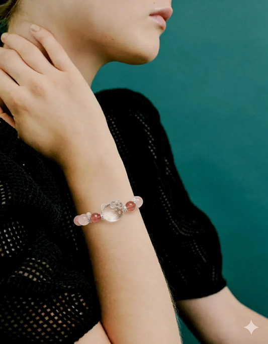 Hello Kitty Crystal Bracelet, Rose Quartz & Strawberry Quartz Beaded Bracelet, Healing Crystal Jewelry,Gift for Her