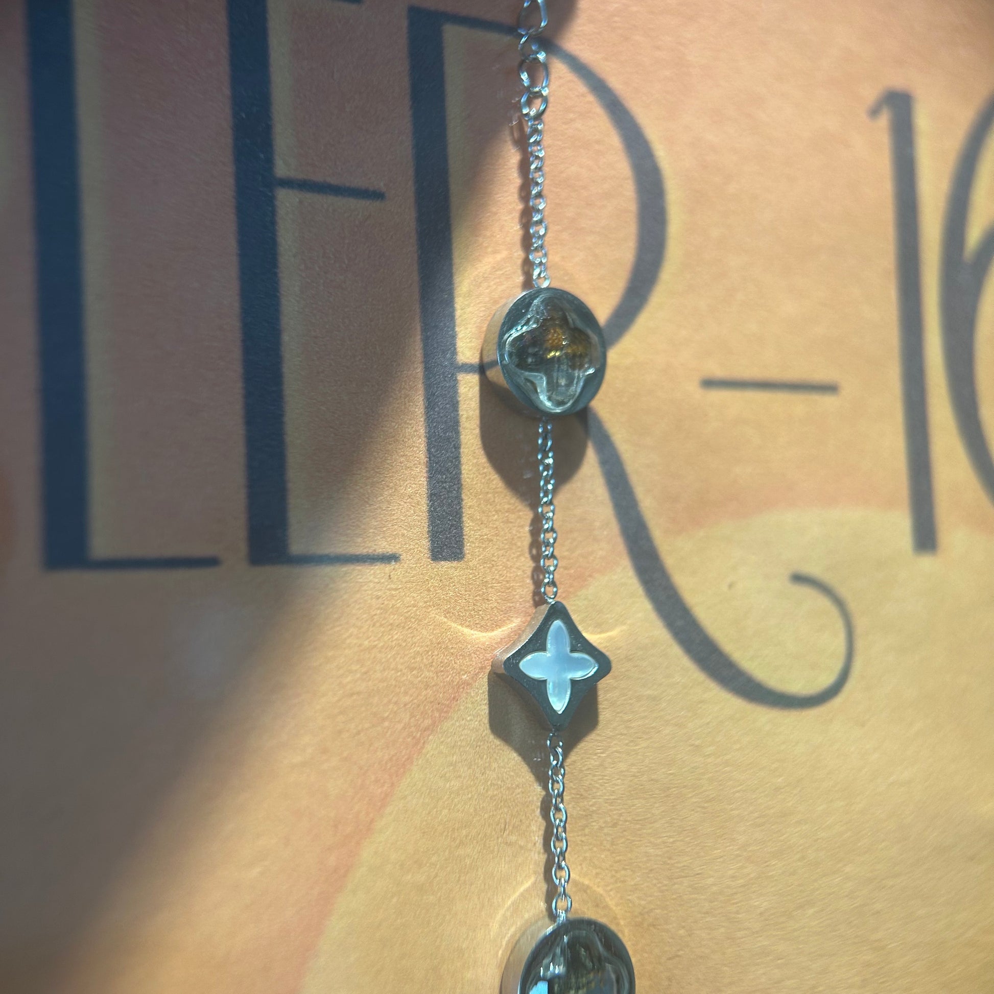 Accents: Clear domed elements with warm gold/grey reflections; diamond-shaped cross accents with a pearly sheen