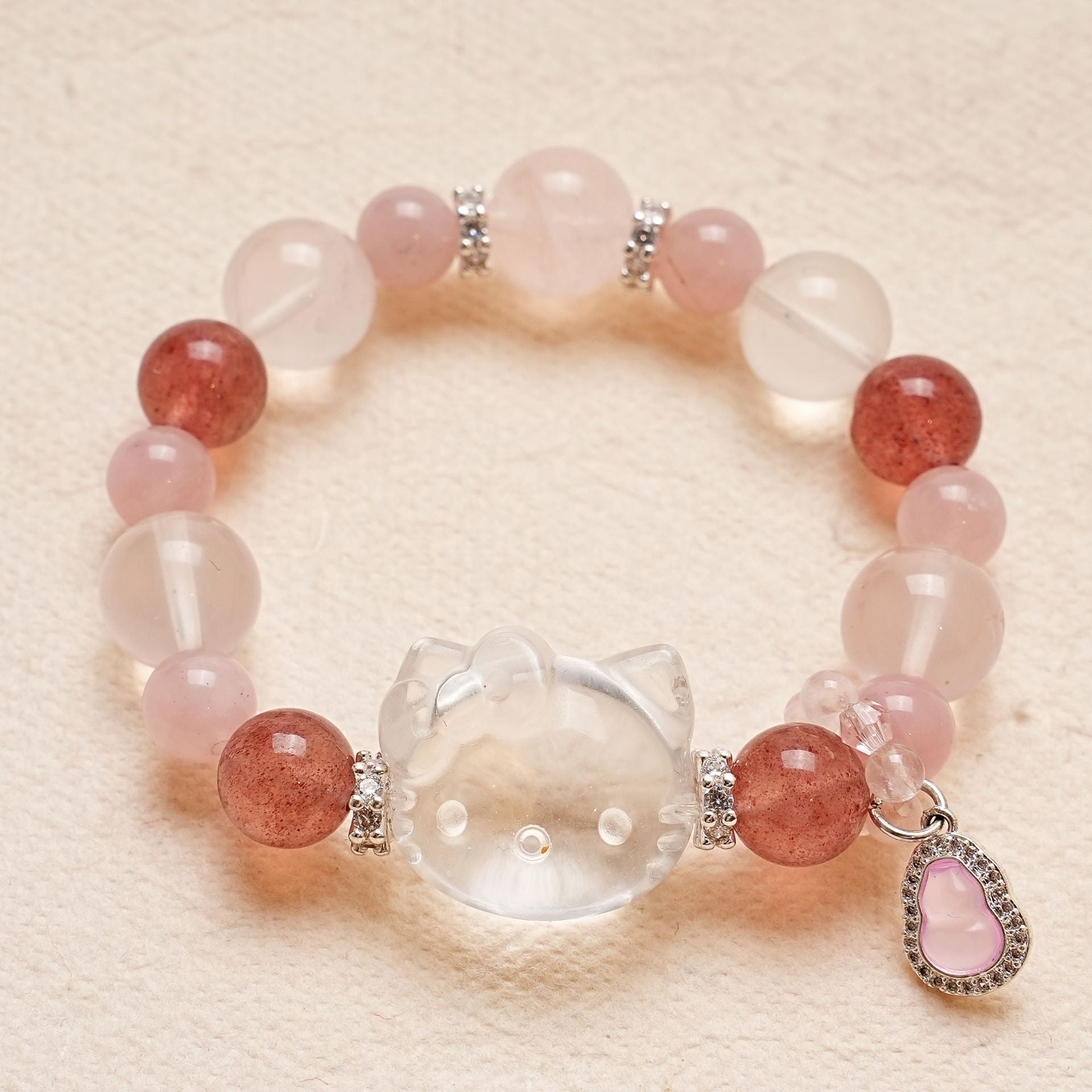 Hello Kitty Crystal Bracelet, Rose Quartz & Strawberry Quartz Beaded Bracelet, Healing Crystal Jewelry,Gift for Her